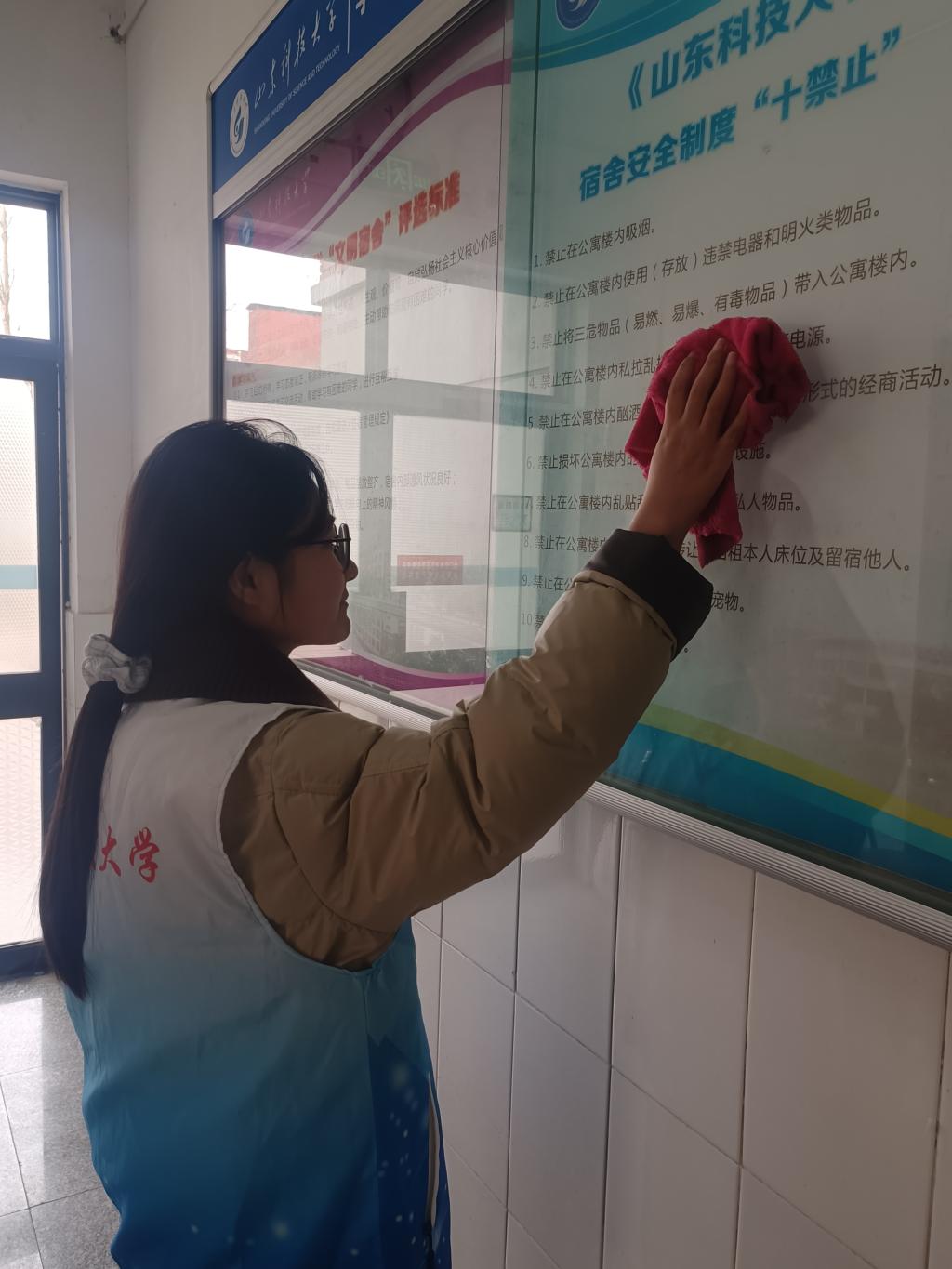 活动当天上午8:30,志愿者们准时在C1、C5宿舍楼门口集结,明确分工后迅速投入工作。卫生清扫现场,大家手持清洁工具,对宿舍楼公共区域开展精细化打理:擦拭楼道宣传栏与墙面污渍,让文明宣传内容清晰醒目;清扫地面垃圾、整理边角杂物,不留一处卫生死角;重点清洁楼梯扶手、门窗等高频接触区域,切实筑牢公共卫生安全防线。志愿者们分工协作、干劲十足,让原本整洁的楼道更显清爽明亮,为同学们打造了更舒适宜居的公共生活空间。